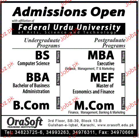 Federal Urdu University Admission in BS, MBA, BBA, MEF and B.Com in Karachi Read newspaper ad for exact details.