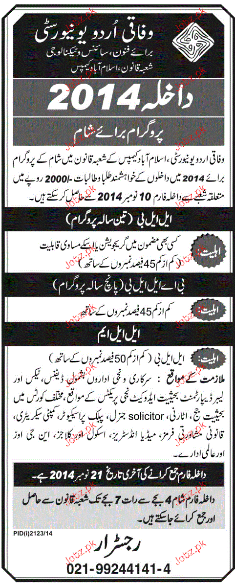 Federal Urdu University Admission in LLB, BA and LLM in Islamabad. Read newspaper ad for exact details.