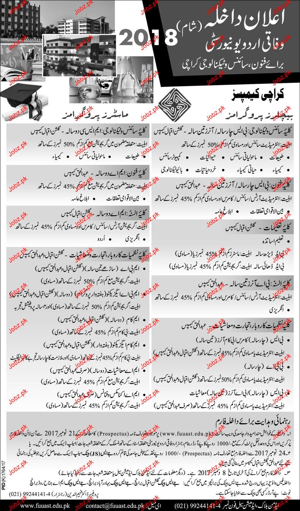 Federal Urdu University for science arts and Technology Admission in BS in Physics, Chemistry, Biology, COmputer Science and MS in Physics, Chemistry, Biology, COmputer Science in Karachi. Read newspaper ad for exact details.
