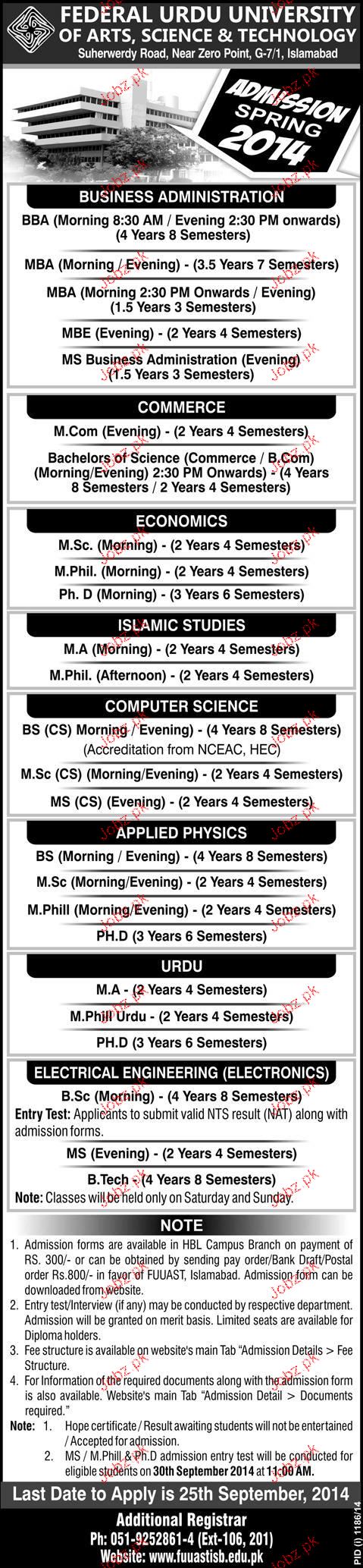 Federal urdu University of Arts, Science & Technology Admission in BBA, MBA, MBE, MS, M.Com, Mphill and BS in Islamabad. Read newspaper ad for exact details.