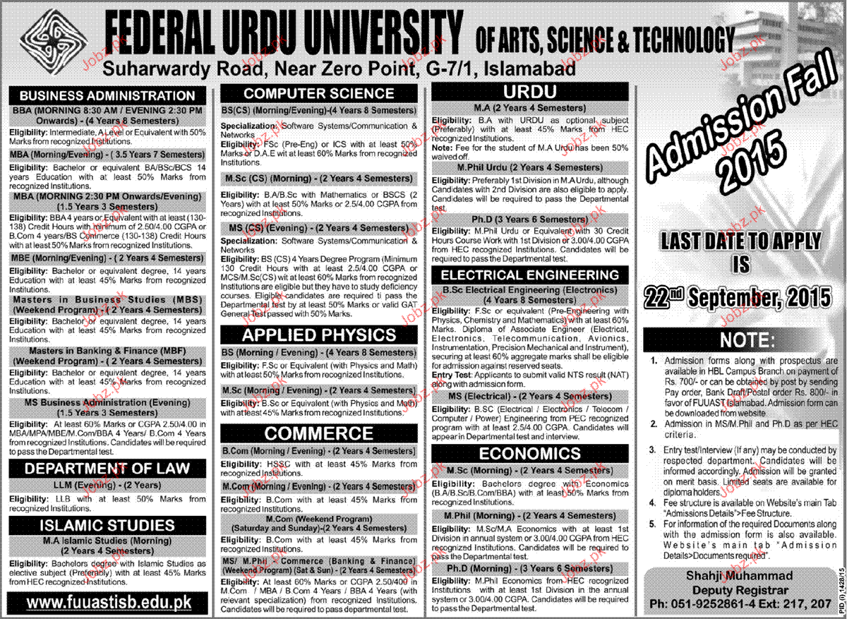 Federal Urdu University of Science and Technology Admission in BS, BBA, MBE, MS and MSc in Islamabad. Read newspaper ad for exact details.