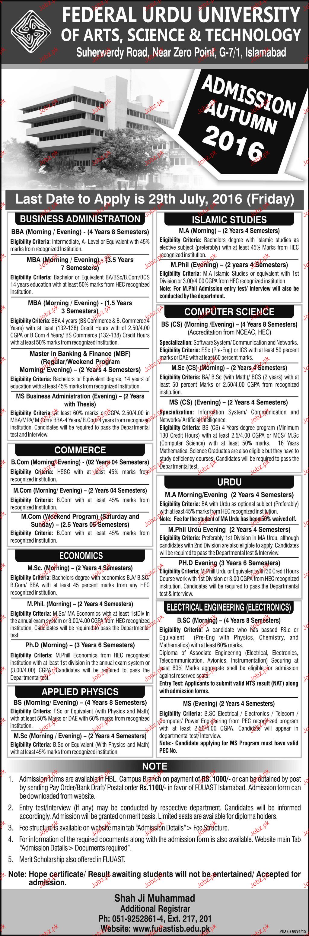 Federal Urdu University of Science and Technology Admission in MBA, Ma and Mphill in Karachi. Read newspaper ad for exact details.