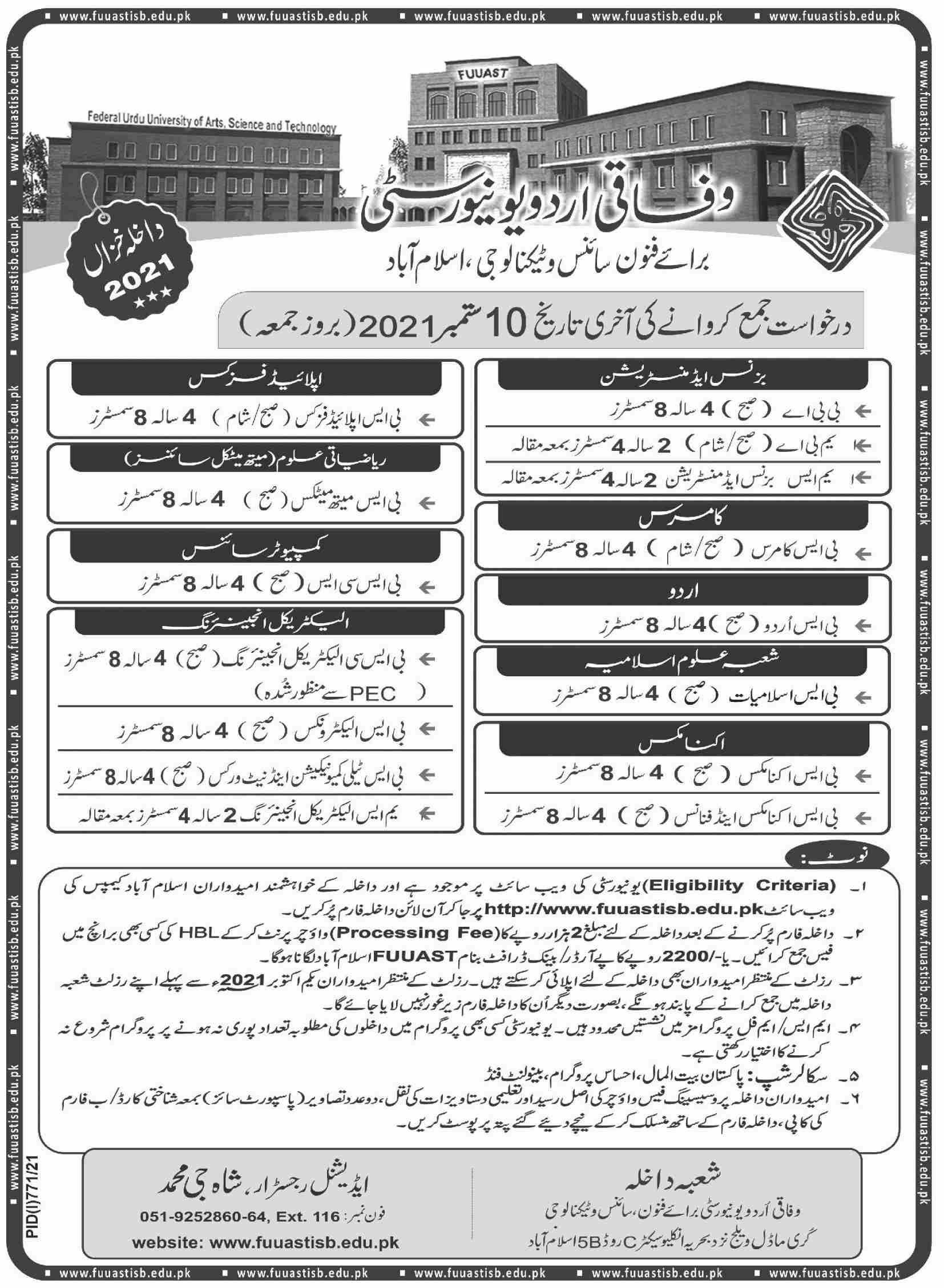 Federal Urdu University of Arts Science And Technology is a public sector university has announced admissions in BBA, MBA, MS, BS, BSCS and BSc degree programs 2021. Read newspaper ad for exact details.