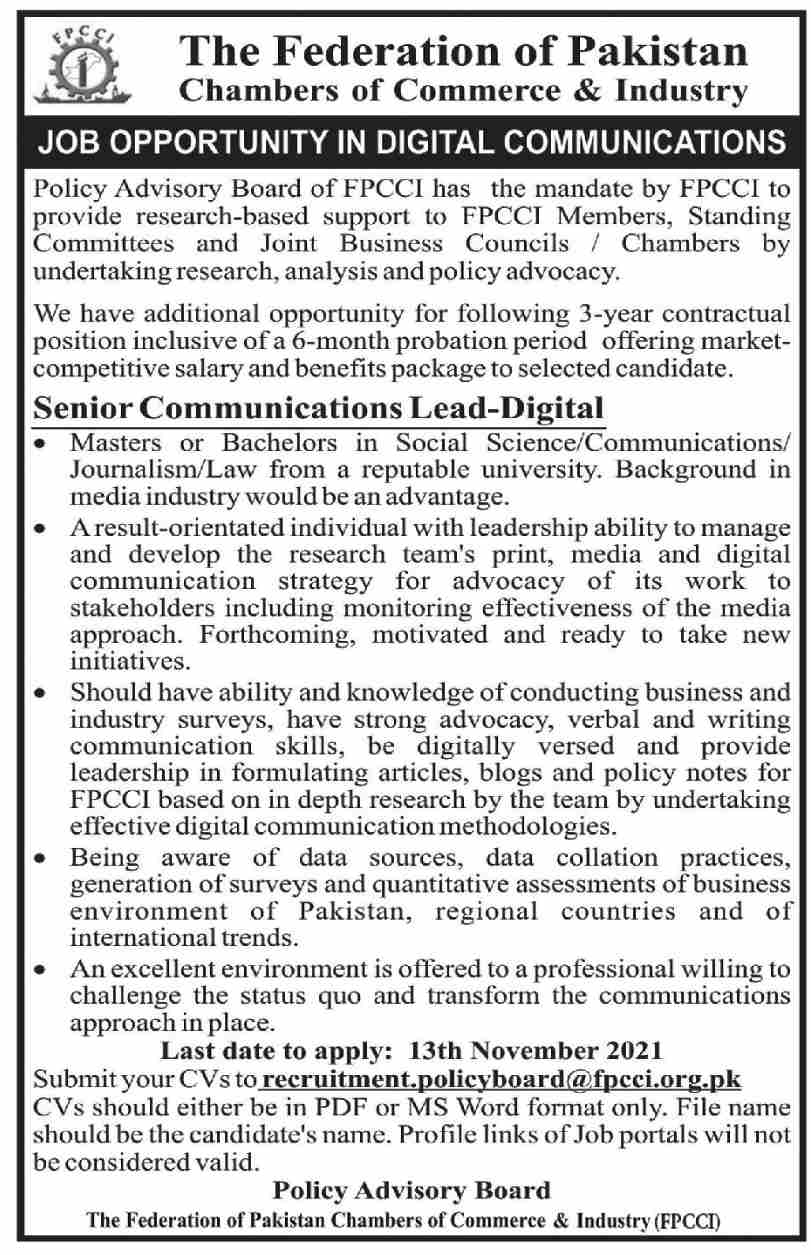 Vacancies in Federation of Pakistan Chambers of Commerce and Industry Advertisement November 2021
