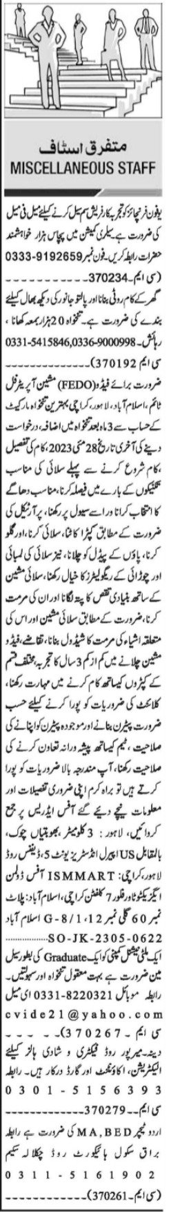 Private Company Islamabad, islamabad Islamabad Pakistan invites applications from eligible candidates for the post of fedo machine operator, accountant, sales staff, salesman, house worker, electrician, teacher and urdu teacher as per advertisement of May 18, 2023 published in daily Jang Newspaper. Candidates with Intermediate, Bachelor, Matric, Middle, MA, DAE, B.com, B.ed, BBA and BA etc. educational background will be preferred.