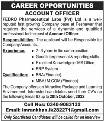 Fedro Pharmaceutical Labs Pvt Ltd is looking for candidates for following posts as per job advertisement published in daily Aaj Newspaper of October 14, 2022 for location Peshawar, peshawar Khyber Pakhtunkhwa KPK Pakistan: