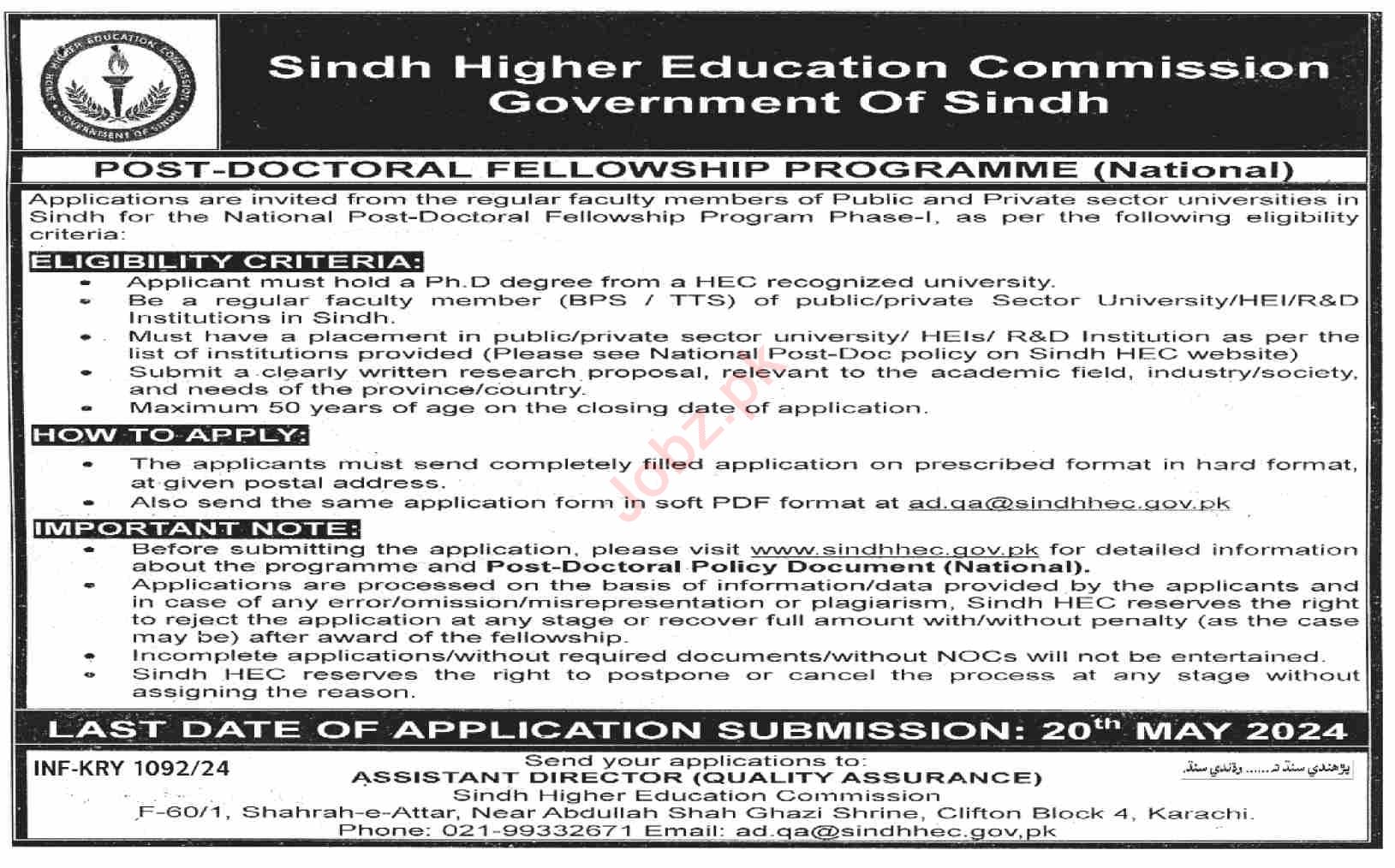Sindh Higher Education Commission SHEC invites applications for job positions advertised in daily Dawn dated 21 April 2024 for following vacancies in Karachi, karachi Sindh Pakistan.