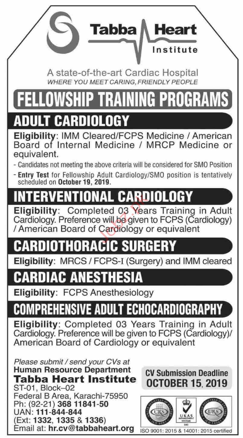Vacancies in Tabba Heart Institute Advertisement September 2019