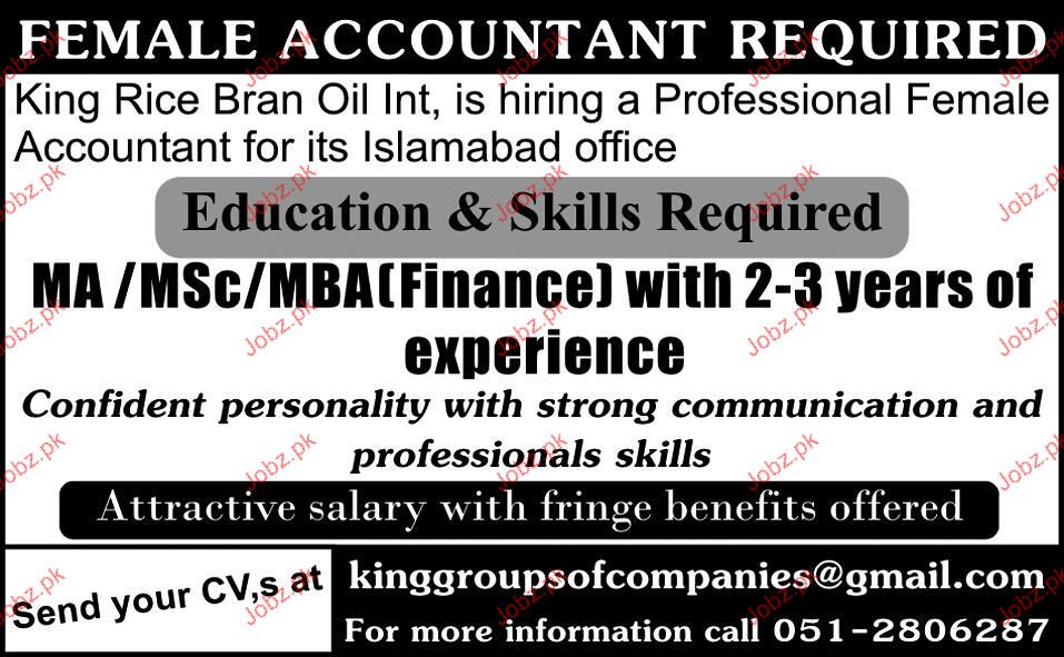 Female Accountant is required in king Rice Bran Oil in Islamabad.