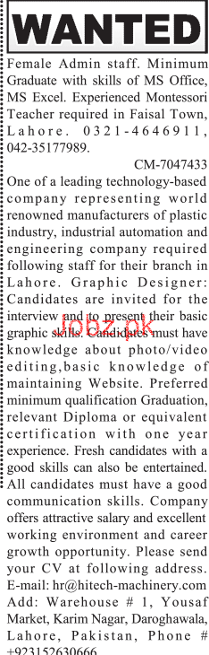 Female Admin Officers, Montessori Teachers Job Opportunity
