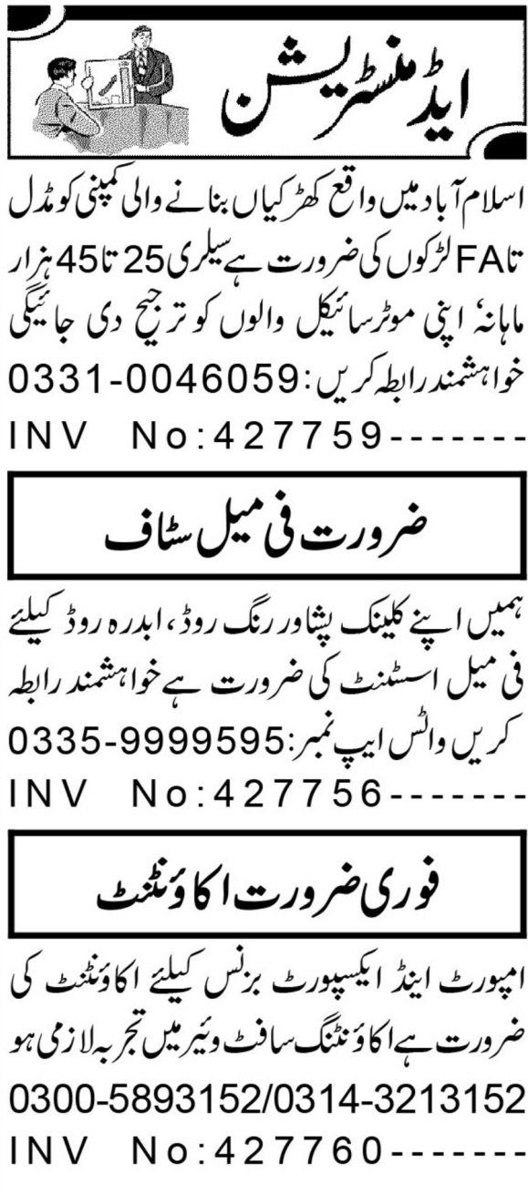 Private Company Peshawar, peshawar Khyber Pakhtunkhwa KPK Pakistan invites applications from eligible candidates for the post of female assistant, accountant and male staff as per advertisement of December 29, 2023 published in daily Aaj Newspaper. Preferred Education is Intermediate, Master and Bachelor etc.