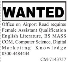 Private Office jobs advertisement dated about 6 March 2024 in daily Jang Newspaper invites application for the vacant post of female assistant and assistant in Lahore, lahore Punjab Pakistan. Educational qualifications required etc.