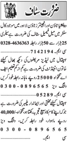Private Company Lahore, lahore Punjab Pakistan invites applications from eligible candidates for the post of call center agent, female attendant, attendant and plumber as per advertisement of January 23, 2024 published in daily Jang Newspaper. Matric, Bachelor, Intermediate, Middle and BA etc. educational qualification will be preferred.