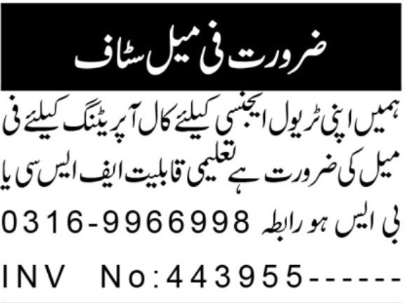 Travel Agency is looking for candidates for following posts as per job advertisement published in daily Aaj Newspaper of August 9, 2025 for location Peshawar, peshawar Khyber Pakhtunkhwa KPK Pakistan: