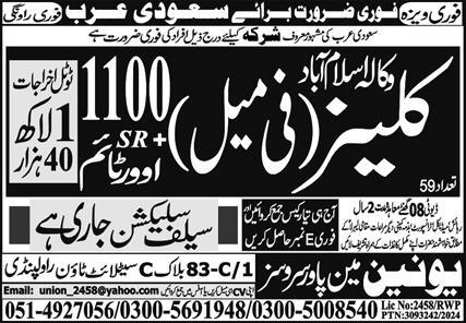 Union Manpower Services invites applications for job positions advertised in daily Express dated 7 February 2025 for following vacancies in Dammam, jeddah Saudi Arabia.
