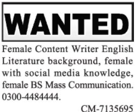 Private jobs advertisement dated about 2 August 2023 in daily Jang Newspaper invites application for the vacant post of female content writer in Lahore, lahore Punjab Pakistan. Candidates with Bachelor etc. educational background will be preferred.