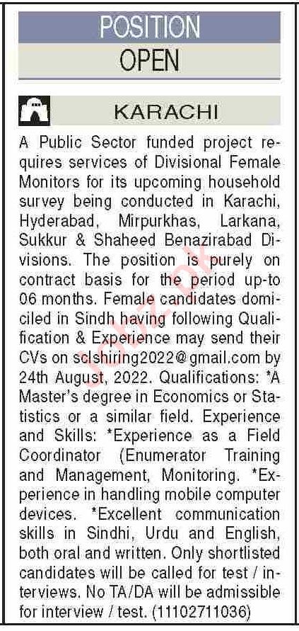 Donor Funded Project jobs advertisement dated about 16 August 2022 in daily Dawn Newspaper invites application for the vacant post of coordinator, divisional female monitor and female coordinator in Karachi, larkana, benazirabad, mirpur khas, nawabshah, sukkur, hyderabad and karachi Sindh Pakistan. Persons with Bachelor etc. education can apply.