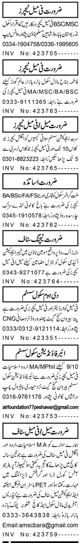 Private School is looking for candidates for following posts as per job advertisement published in daily Aaj Newspaper of August 26, 2023 for location Peshawar, peshawar Khyber Pakhtunkhwa KPK Pakistan: