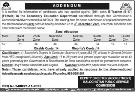 BPSC Balochistan Public Service Commission jobs advertisement dated about 22 November 2025 in daily Other Newspaper invites application for the vacant post of female it teacher in Quetta, quetta Balochistan Pakistan. Bachelor, Mphil and Master etc. educational qualification will be preferred.