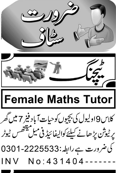 Vacant posts including maths teacher, teacher and female maths tutor are announced in Academy Peshawar, peshawar Khyber Pakhtunkhwa KPK Pakistan as per 28 May 2024 advertisement in daily Aaj Newspaper. Educational qualifications required Bachelor and Master etc.