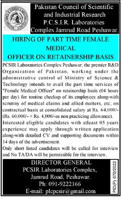 PCSIR Laboratories Complex Peshawar, peshawar Khyber Pakhtunkhwa KPK Pakistan invites applications from eligible candidates for the post of female medical officer as per advertisement of March 21, 2022 published in daily Mashriq Newspaper. Persons with MBBS etc. education can apply.