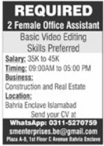Private Company jobs advertisement dated about 22 March 2025 in daily Jang Newspaper invites application for the vacant post of female office assistant in Islamabad, islamabad Islamabad Pakistan. Candidates with Bachelor etc. educational background will be preferred.