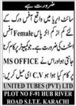 Vacant posts including female office assistant are announced in United Tubes Pvt Limited Hub River Road Karachi, karachi Sindh Pakistan as per 11 May 2025 advertisement in daily Jang Newspaper. Candidates with Intermediate etc. educational background will be preferred.