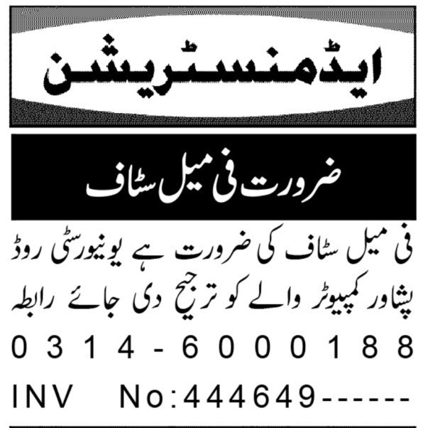 Private Company University Road Peshawar, peshawar Khyber Pakhtunkhwa KPK Pakistan invites applications from eligible candidates for the post of female office staff and office staff as per advertisement of September 2, 2025 published in daily Aaj Newspaper. Educational qualifications required Bachelor and Intermediate etc.