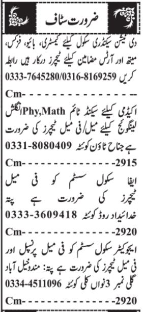 Private School is looking for candidates for following posts as per job advertisement published in daily Jang Newspaper of March 5, 2022 for location Quetta, quetta Balochistan Pakistan: