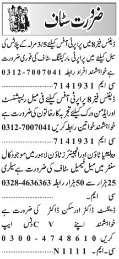 Private Company jobs advertisement dated about 11 January 2024 in daily Jang Newspaper invites application for the vacant post of female receptionist, call center staff, skin doctor, dentist doctor, property marketing staff, dentist, admin manager, real estate agent, receptionist, doctor and call center agent in Lahore, lahore Punjab Pakistan. BA, Bachelor, Matric, Intermediate, MBBS and Middle etc. educational qualification will be preferred.
