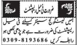 Language Center jobs advertisement dated about 18 January 2023 in daily Jang Newspaper invites application for the vacant post of female receptionist and receptionist in Quetta, quetta Balochistan Pakistan. Educational qualifications required Bachelor and Intermediate etc.