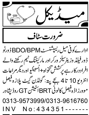 Medicine Company Peshawar, peshawar Khyber Pakhtunkhwa KPK Pakistan invites applications from eligible candidates for the post of marketing team, female receptionist, sales worker, field visitor and receptionist as per advertisement of September 5, 2024 published in daily Aaj Newspaper. Persons with Matric, Bachelor, Intermediate and BA etc. education can apply.