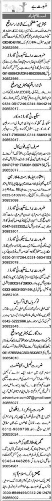 Private Company Islamabad, rawalpindi and islamabad Islamabad Pakistan invites applications from eligible candidates for the post of watchman, cashier, supervisor guard, civil security guard, ltv driver, electrician, cook helper, chef, guard, chowkidar, sweeper, attendant, female receptionist, cook, office boy, house worker, fauji security guard, sanitary worker, security guard, jco, havaldar, operational supervisor, receptionist, driver and kitchen helper as per advertisement of April 26, 2022 published in daily Express Newspaper. Candidates with Matric, Middle, Intermediate and Bachelor etc. educational background will be preferred.