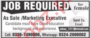 Female Sales & Marketing Executive Jobs 2019 In Lahore
