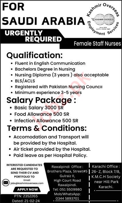 Kashmir Overseas Employment Services Riyadh, riyadh Saudi Arabia invites applications from eligible candidates for the post of female staff nurse as per advertisement of February 25, 2024 published in daily Express Newspaper. Candidates with Bachelor etc. educational background will be preferred.