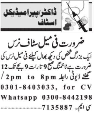 Hospital Clinic Lahore, lahore Punjab Pakistan invites applications from eligible candidates for the post of female staff nurse, nurse and staff nurse as per advertisement of August 5, 2023 published in daily Jang Newspaper. Persons with Intermediate and Matric etc. education can apply.
