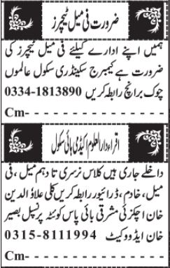 Private School Quetta, quetta Balochistan Pakistan invites applications from eligible candidates for the post of khadmin, female teacher, teacher and driver as per advertisement of March 8, 2024 published in daily Jang Newspaper. Matric, M.sc, MA, Bachelor and Master etc. educational qualification will be preferred.