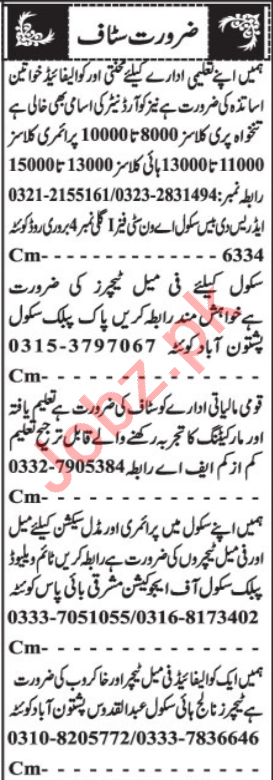 Teacher, English Teacher, Chemistry Teacher, Physics Teacher, Coordinator, Accountant, Cost Accountant, Accountant, Auditor, Accounts Officer, Assistant Accounts, Internal Auditor, External Auditor, General Manager Finance, Finance Officer, Biology Teacher, Maths Teacher, Urdu Teacher seeks in well reputed companies and schools.