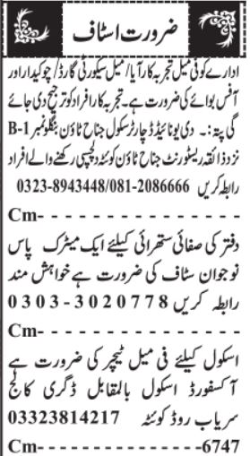 Private Company is looking for candidates for following posts as per job advertisement published in daily Jang Newspaper of April 17, 2025 for location Jinnah Town Quetta, quetta Balochistan Pakistan: