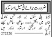 Nishat High School jobs advertisement dated about 3 May 2023 in daily Khabrain Newspaper invites application for the vacant post of science teacher, female teacher, urdu teacher, mathematics teacher, english teacher and teacher in Multan, multan Punjab Pakistan. Candidates with M.ed, MA, B.ed, M.sc, Master, BA and Bachelor etc. educational background will be preferred.