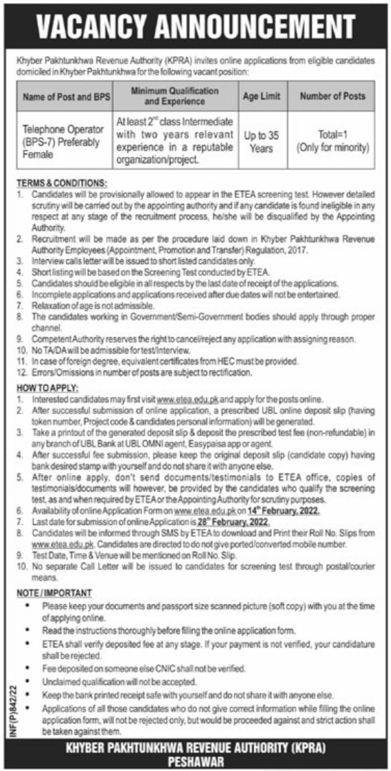 Latest Telephone Operator jobs and others Government jobs in Khyber Pakhtunkhwa Revenue Authority KPRA closing date is around February 28, 2022, see exact from ad. Read complete ad online via ETEA to know how to apply on latest Khyber Pakhtunkhwa Revenue Authority KPRA job opportunities. Apply Online.