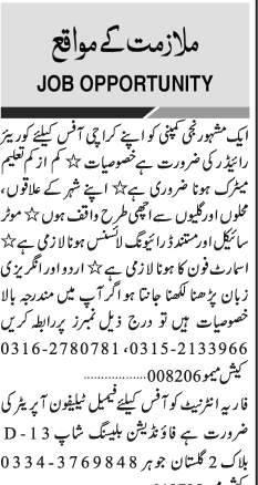 Apply as per details in job advertisement. Login to view further details of how to apply via https://www.jobz.pk online.