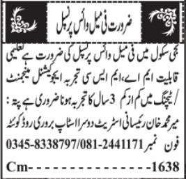 Vacant posts including female vice principal are announced in Private School Quetta, quetta Balochistan Pakistan as per 6 March 2023 advertisement in daily Jang Newspaper. Candidates with M.sc and MA etc. educational background will be preferred.