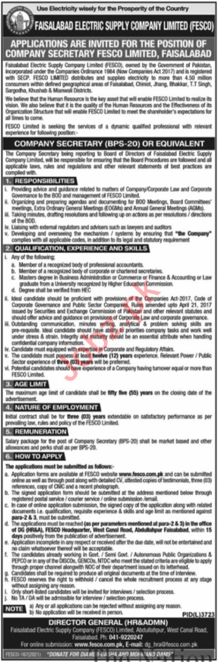 Vacancies in Faisalabad Electric Supply Company Limited FESCO Advertisement June 2021