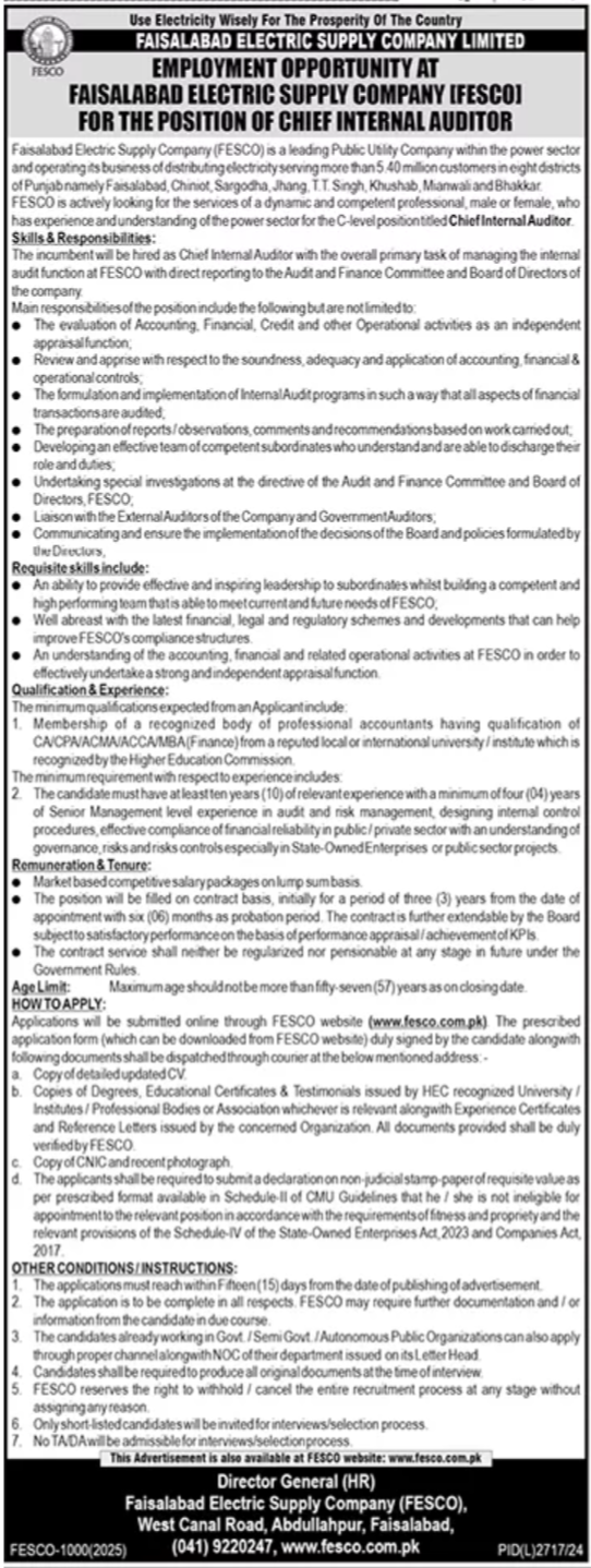 FESCO Faisalabad Jobs 2025 for Chief Internal Auditor