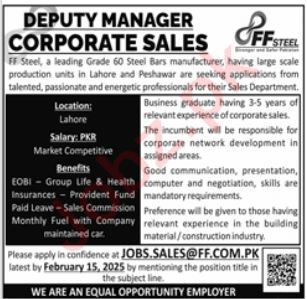 FF Steel Manufacturing Industry invites applications for job positions advertised in daily Jang dated 9 February 2025 for following vacancies in Lahore, lahore Punjab Pakistan.