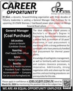 FF Steel Manufacturing Industry jobs advertisement dated about 17 March 2024 in daily The News Newspaper invites application for the vacant post of general manager coal purchase in Lahore, lahore Punjab Pakistan. Persons with Bachelor, Master and MS etc. education can apply.