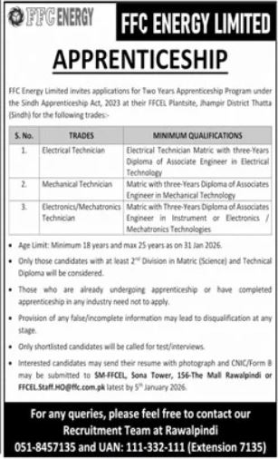 Vacant posts including apprenticeship program, electronic technician, electrical technician, mechanic technician and mechanical technician are announced in FFC Energy Limited Rawalpindi, rawalpindi Punjab Pakistan as per 14 December 2025 advertisement in daily Jang Newspaper. Preferred Education is Intermediate and Bachelor etc.