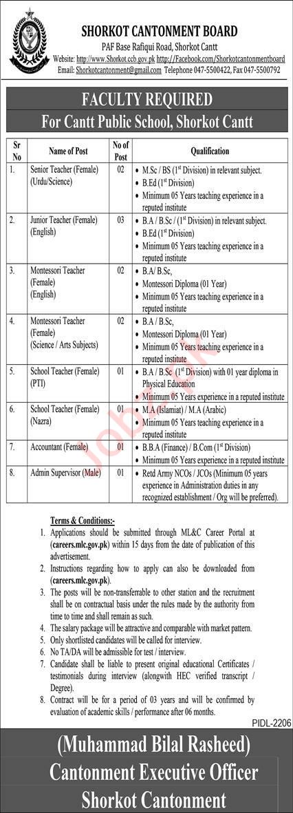 Vacant posts including accountant, english teacher, school teacher, pti, teacher, science teacher, montessori teacher, admin supervisor, urdu teacher and nazra teacher are announced in Cantt Public School System Shorkot, shorkot Punjab Pakistan as per 29 January 2023 advertisement in daily Express Newspaper. Persons with M.sc, B.ed, Matric, Master, Intermediate, Bachelor and BBA etc. education can apply.