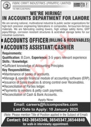 Vacant posts including billing officer, cashier, accounts receivable officer, accounts assistant and accounts officer are announced in Fiber Craft Industries FCI Lahore, lahore Punjab Pakistan as per 5 January 2025 advertisement in daily Jang Newspaper. Educational qualifications required Others, MBA, Bachelor, ACCA and Master etc.